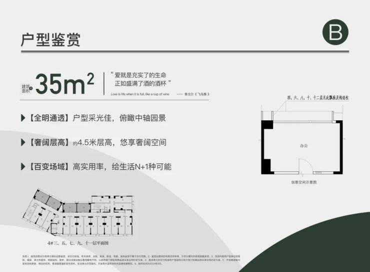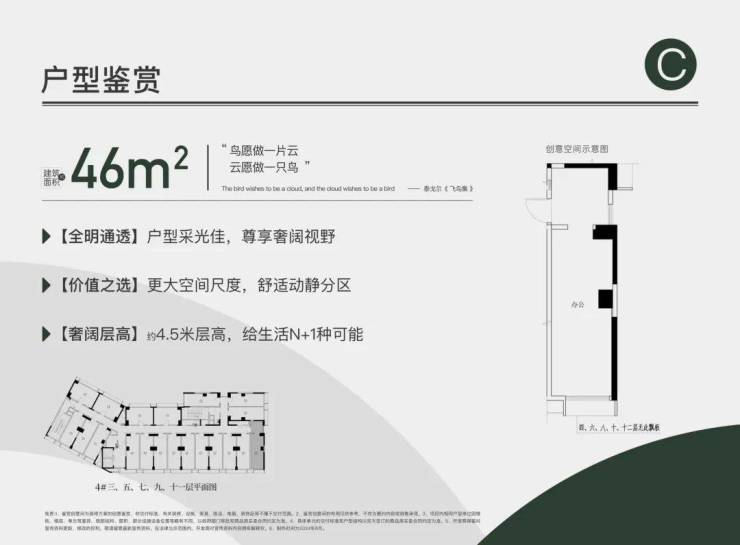 越秀大学城和樾府飞鸟集公寓仅有两栋楼,公寓总层高仅13层,户型涵盖35-46-48-61㎡。全部都是4.5米层高的复式公寓,目前项目公寓主要在售4号楼的现楼产品。