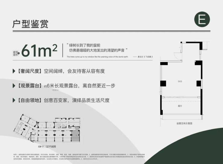 剩下的大面积特殊户型48㎡和61㎡则仅有13楼顶楼才有,非常稀缺全部都是带露台设计,整栋特殊户型48㎡仅有4套,61㎡户型仅有一套,这种带露台特殊户型全部一线中央公园景观,当然价格也会比其他户型贵一些。