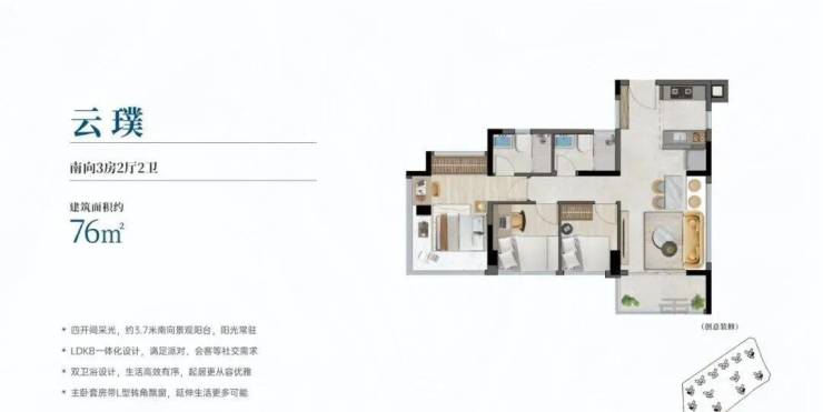 广开云翰为知识城片区首批新规住宅产品,规划建面约76-142㎡刚需刚改三至五房,户户全南向大面宽产品,三至五开间采光,保证空间通透敞亮;户型实用率均超100%,最高可达约115%,带来空间享受的全面升级,品质学府人居,敬献知识城新贵。