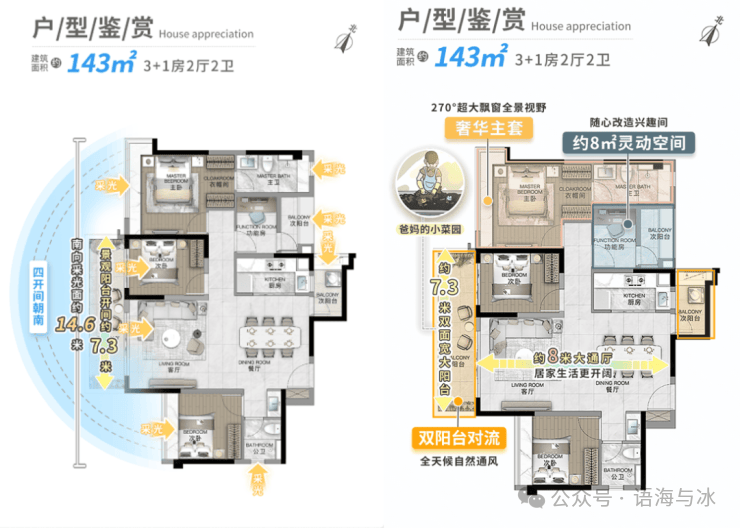 领南府推出约98-143㎡的多种户型选择,涵盖2+1房至3+1房的不同面积段,适合不同家庭结构的需求。所有户型均采用全南向设计,确保每个房间都能获得良好的采光和通风效果。部分户型特别设计了豪华主卧套房,配备270°转角飘窗,增加了居住的私密性和舒适度。此外,户型设计注重动静分区,客厅与卧室分开布置,营造出安静和谐的家庭氛围。