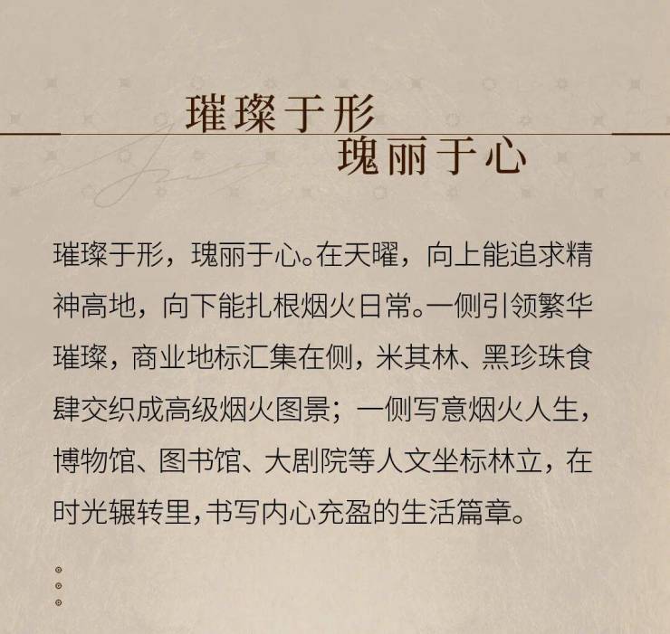 【曜】字义为太阳,光明大盛;【天曜】代表“城市中心、配套一应俱全”的土地禀赋,也象征“事业光明、阅历丰富”的生活状态;保利·天曜是全国首座“天曜”,将打造保利全新天字系标杆。