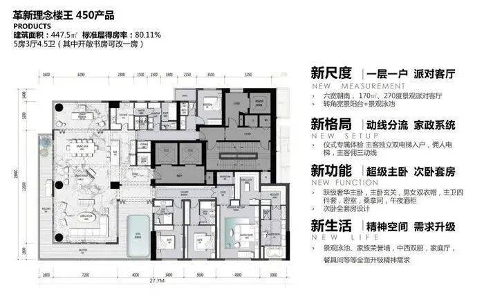447.5㎡是项目革新理念楼王450产品,为5房3厅4.5卫设计(其中开敞书房可改为一房),得房率为80.11%。