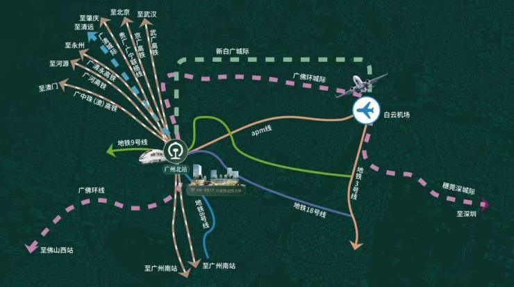 以空铁融合、站城一体规划北站商务区,构筑城市发展的向芯力;依托T4航站楼及白云机场快速APM线,实现广州北枢纽+空铁联运+商务中芯三大能级联动,打造引领珠三角、辐射中国南部、面向世界的生活中芯场域