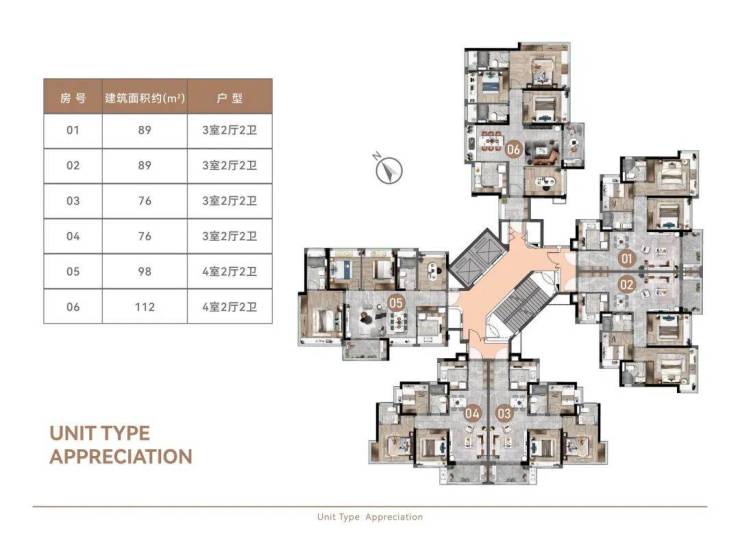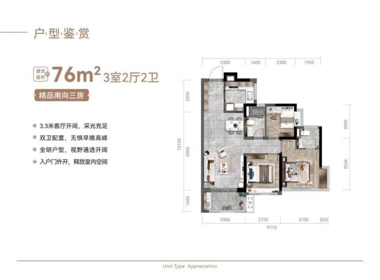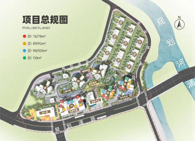 项目总建面约19.08万㎡,占地4.26万㎡,容积率3.2,绿化率35%,规划6栋高层、21栋别墅共1229户,车位比1:1.2,停车便捷。主推76-110㎡三至四房精装户型,实用率高达90%,户型方正通透、全南向布局,涵盖刚需入门与改善升级款,社区打造一环两轴多院落景观,配套400米健康步道、亲子乐园等八大主题空间。