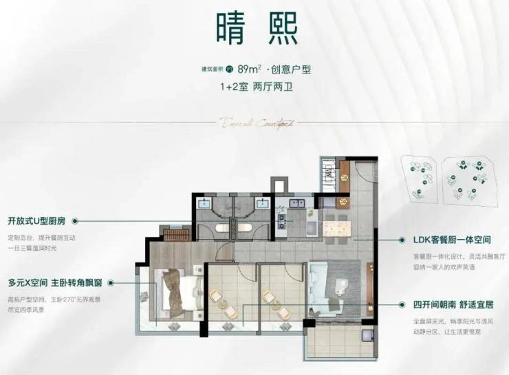 书房、茶室、儿童乐园之间自由组合的多元X空间,做到了多1房; 客餐厅的大横厅设计,空间感更好;主卧270°转角飘窗,带来更大的采光、景观面;U型厨房、定制岛台,可以让做饭充满乐趣……