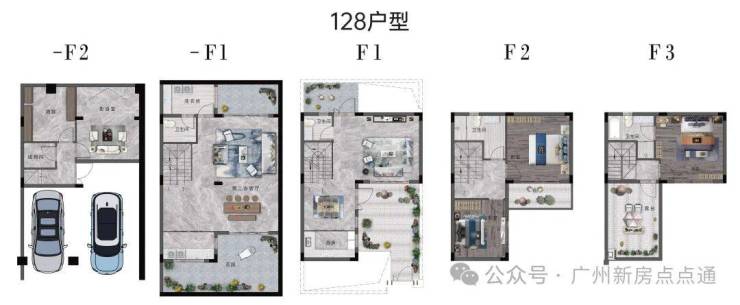 『户型鉴赏』【128㎡户型】联排设计、前庭后院、观星露台、采光与私密性极佳;超高附赠率,有天有地有花园,私家车位入库!(以下图片和视频仅作参考,实际交付为毛坯)