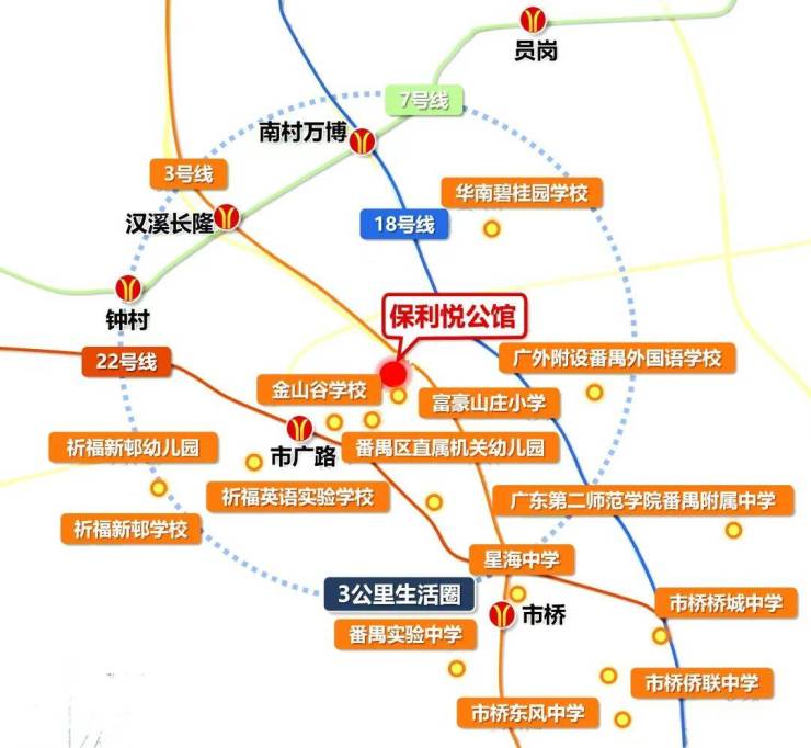 周边还分布有多所幼儿园、小学等,譬如番禺直属机关幼儿园(省一级幼儿园)、金山谷中学部、富豪山庄小学等。