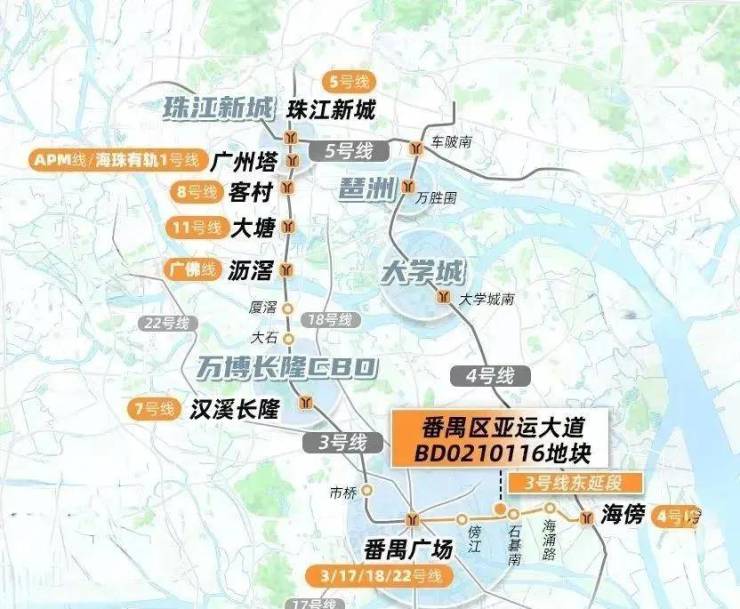 1站之外的傍江站,龙湖天街已经在建;2站到番禺广场,有永旺梦乐城、百德商业中心等商业。