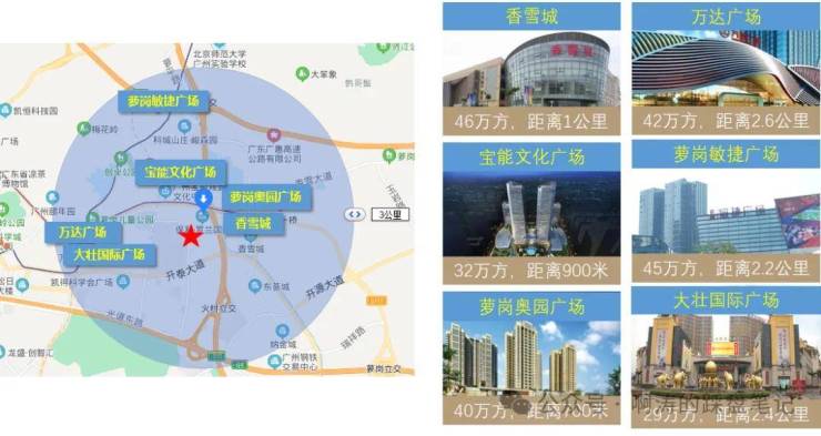 🏙共计约300万㎡醇熟商圈,萝岗万达、锐丰中心、奥园广场、保利未来香雪城(在建)等10大商圈环伺,体量相当于18.7个天河“天河城”(建面16万㎡)。