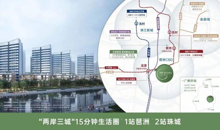 项目距离地铁18号线龙潭站约1200米,并临近地铁11号线(在建中),双轨交汇提升通勤效率。18号线作为广州最快的市域快线,可快速连接珠江新城、琶洲等核心商圈,自驾方面,项目靠近新港路、新滘路等城市主干道,开车可便捷通达珠江新城、广州塔、万胜围等地,通勤时间控制在30分钟内,对于在珠金琶工作的精英人士来说较为便利。