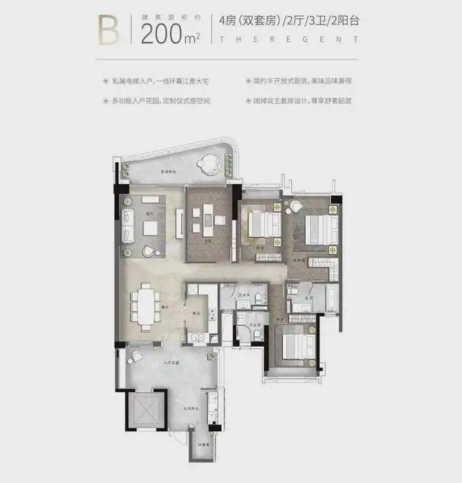 『天启』组团面积约140-250㎡环幕临江大平层,坐拥江景第一排,眺望小蛮腰,享500米宽阔无遮挡江景视野,并邀请三大全球知名设计大师倾力打造,并配备12大国际一线品牌交标,专梯专户四房双套房设计,世界灵感前沿作品礼献广州!