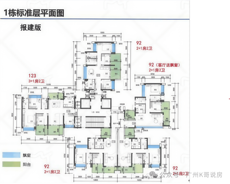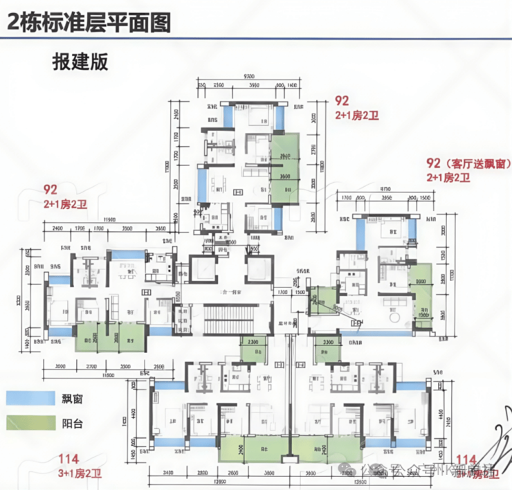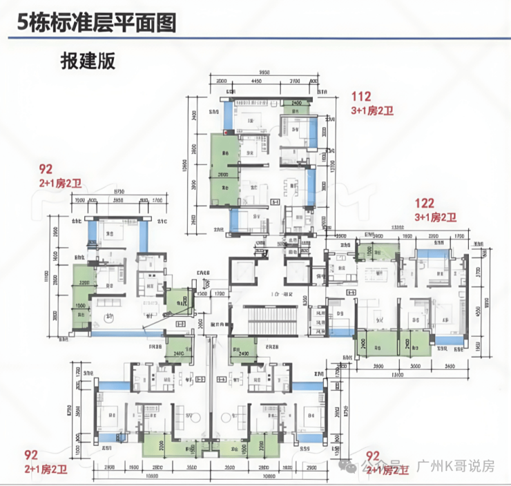 项目主推92-141㎡三至五房,全南向设计,主打高使用率,最高可以达到118%,关键词:110%+使用率、2梯3-5户、全南向。