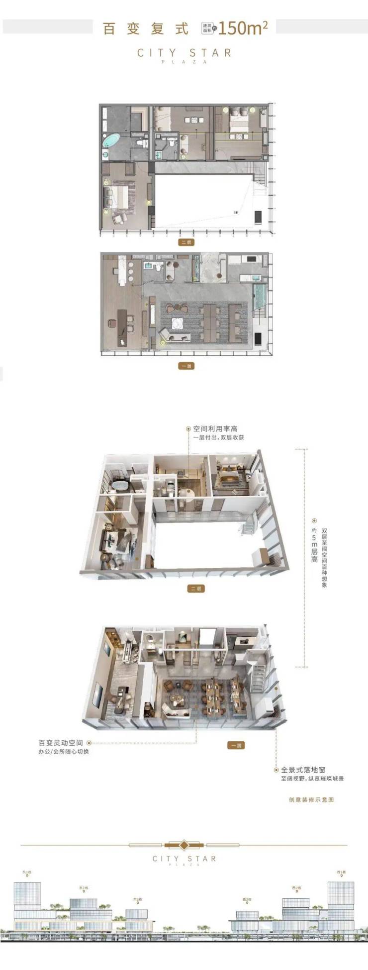 【约150㎡百变复式】:约5米挑高复式,灵动空间双倍实用率,办公、会所灵活转换,资产配置“投”号之选。
