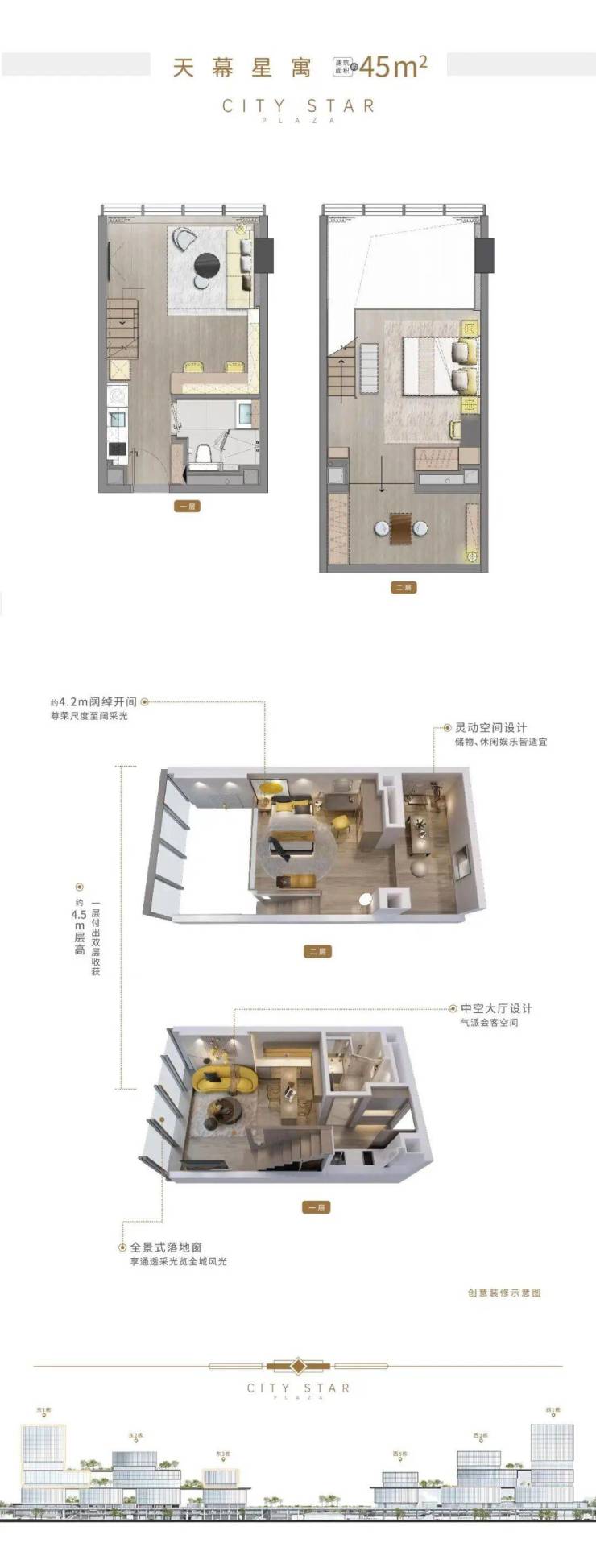 【约45㎡天幕星寓】:约4.2米阔尺开间金领小户型,低门槛轻松买入地铁上盖物业,约4.5米挑高双层享受,双层动静分区,宜商宜租。