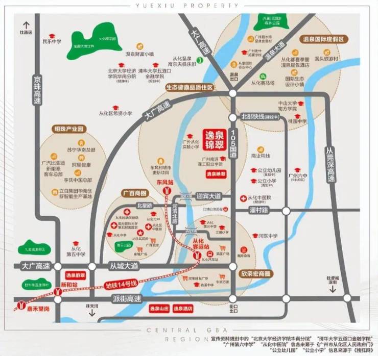周边教育:广外实验小学,广州六中(从化校区,建设中),广州南洋理工职业学校,从化中学,广大附属从化实验中小学(建设中),北京大学经济学院华南分院,清华大学五道口金融学院从化教学项目。