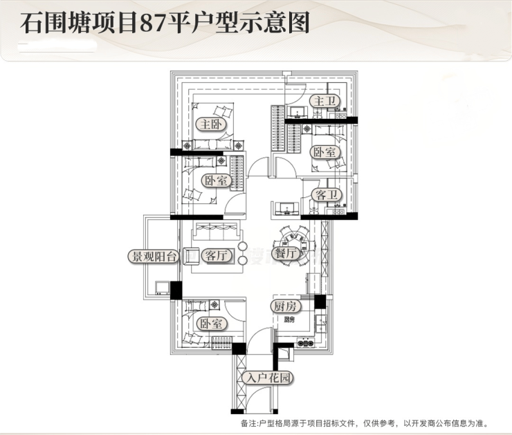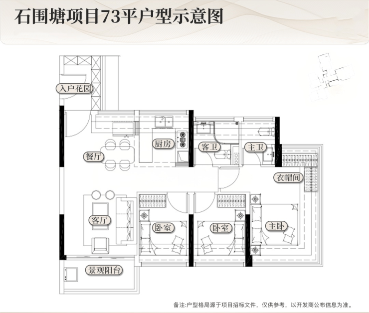 招标文件还意外披露了户型图,主打建面约73-106平,3房1.5卫起步,87平做四房,很牛!