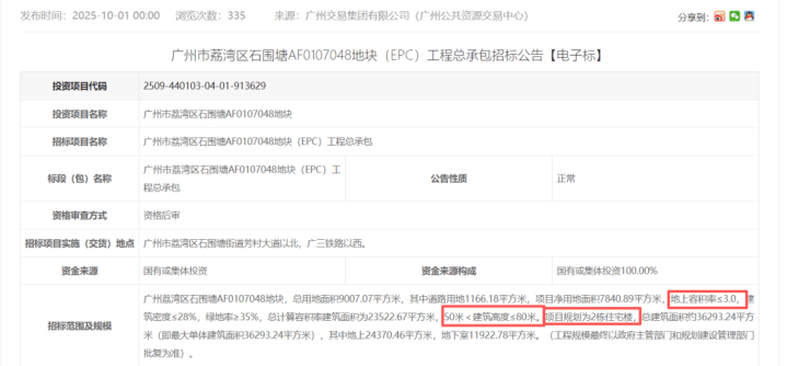 石围塘地块宗地面积9007平,建筑面积23552平,容积率3。