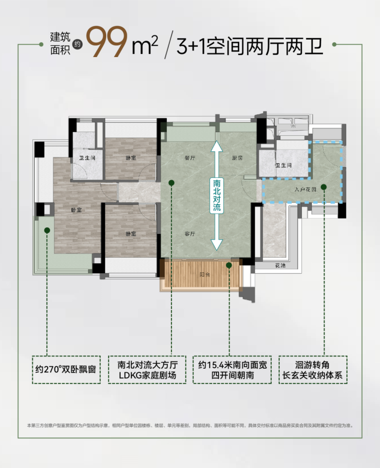 南北对流大方厅|约15.4米南向大面宽|约270°主卧飘窗