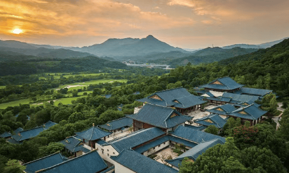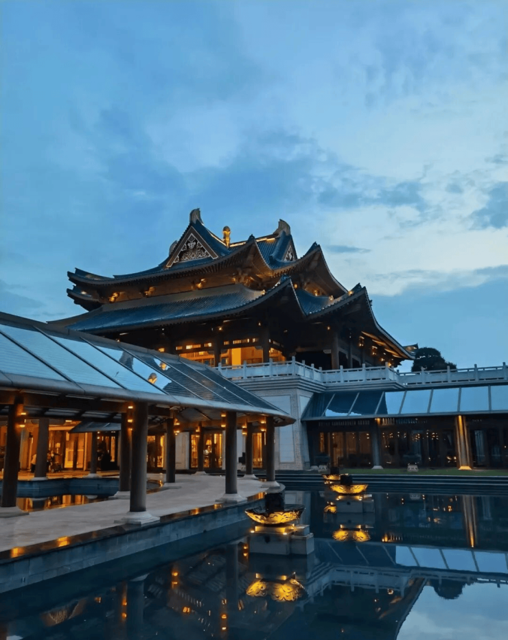 踏入从都国际庄园,仿佛穿越千年,回到大气磅礴的盛唐时代。蓝顶大柱,墨色板岩瓦,梨花白般的石墙,三种简单的颜色在一片绿色的包围中透露着静谧的中式禅味。