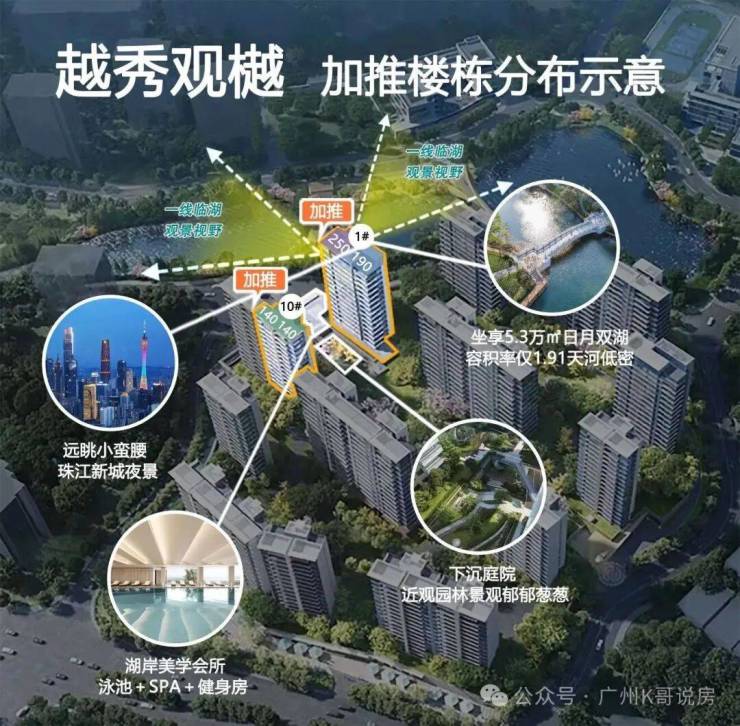 45-52米的低密度小高层,按照“前低后高”的建筑高度控制,形成朝向湖区梯级跌落的设计,大地块西北向望湖景,小地块西向往湖景。越秀观樾售楼处电话: 400-832-5521