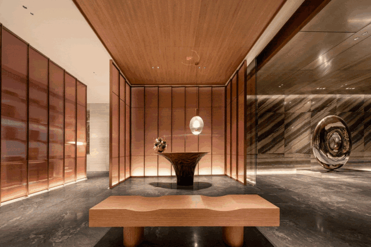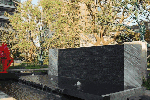 项目社区的园林景观由新加坡JTL加特林设计公司执笔,在CBD核心区勾勒出一座全材艺境。阶梯式的入口设计,寓意着步步高升;天圆地方的主入口门楼搭配着进口透光奢石背景墙面以及寓意长寿富贵的珍稀罗汉松,还原传统归家礼序。穿过门楼,由幻影蓝、大西洋灰等天然奢石打造的迎宾水院映入眼帘,多株特选高大乔木掩映在流水景墙后,自然生趣与奢华质感交相辉映。由金属格栅与大理石围合的景观会客厅,配有电子壁炉与皮质沙发,在匠心剪裁的英式花境中构筑私密社交场。中轴连廊巧妙串联起归家动线,通过奢材与定制金属廊架勾勒仪式感,转步之间,尽显空间流动美学。