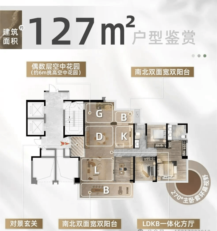 能做到4室2厅布局,LDKBG一体化方厅,南北对流布局和双阳台双景观,约27㎡五星级主套、转角270°环幕视野,约10米采光面,实际使用面积能到152㎡。
