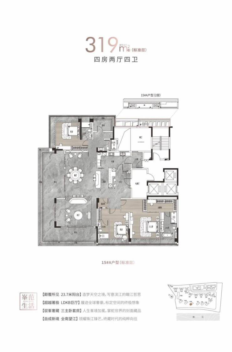 【户型面积】:约125-142㎡四房两厅两卫/214-313㎡大平层