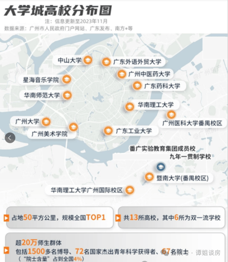 智识高地,同质而居:与暨大、华工国际校区为邻,13所高校环绕、约20万师生聚集,高知人才的聚居地。
