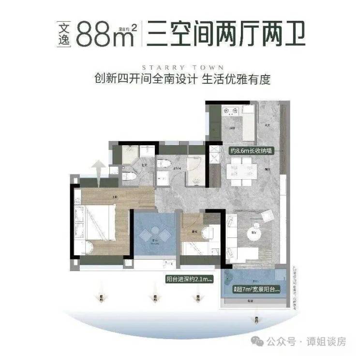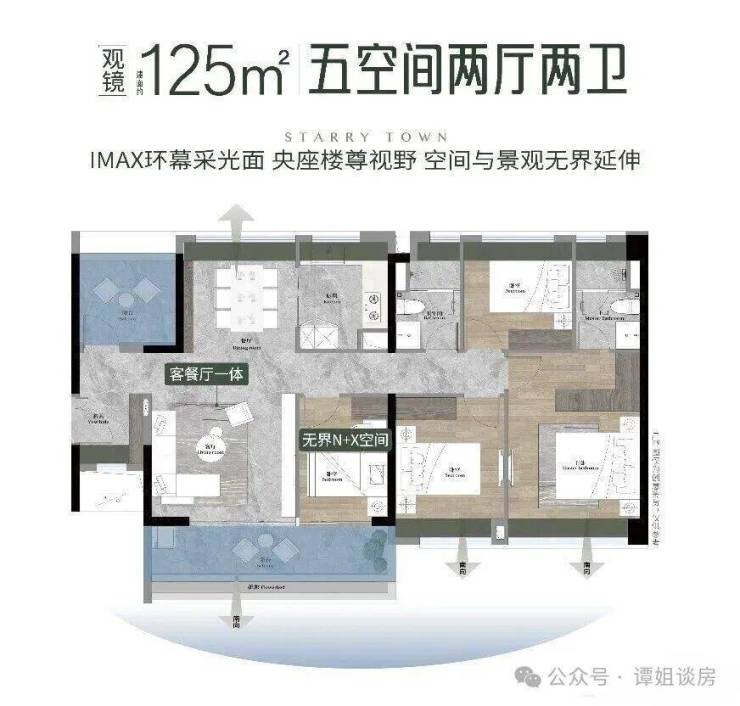 在售建面约88-125㎡三至五空间,户户朝南,皆为270°宽景大阳台,4-4.5面宽朝南,高使用率产品。