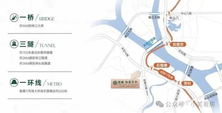步行约600米可达11号线石围塘站,可便捷换乘多条地铁线路,通达全城。1站如意坊换乘6号线,1站芳村换乘1号线/22号线(建设中)2站中山八换乘5号线,直通珠江新城。