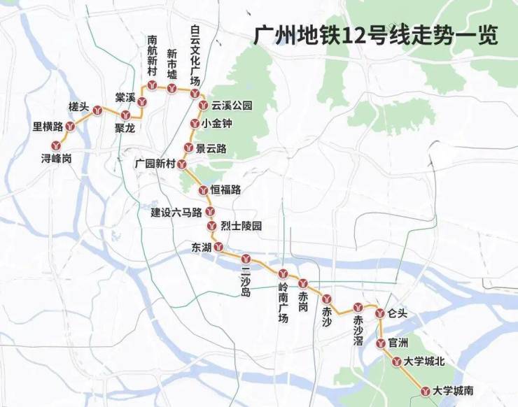 12号线(预计2025年通车)-广州换乘之王,广州市第一条无人驾驶地铁线路,与十数条轨道线无缝换乘,共经过白云文化广场、烈士陵园、二沙岛、赤沙等17个换乘站,可直达大学城,连通白云、越秀、海珠、番禺四大区域。