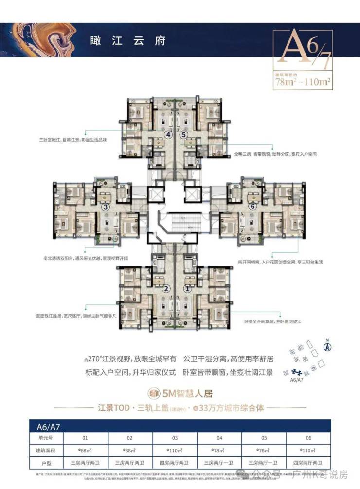 整个槎头站TOD项目一共分为三期开发,其中一期的五矿招商江天际是由五矿地产、招商蛇口和广州地铁三大开发商携手合作打造,一共有12栋,其中9栋17-33层住宅,3栋公寓,总规划户数大约是1407户