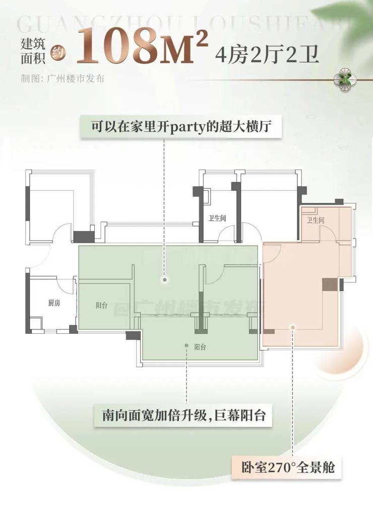 建面约108平户型,拥有加倍升级面宽的巨幕阳台,超大横厅在家就能开party!