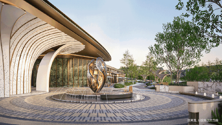 酒店式落客区同样以榕树为灵感,以水景雕塑为核心,大量采用名贵石材设计为“年轮广场”。