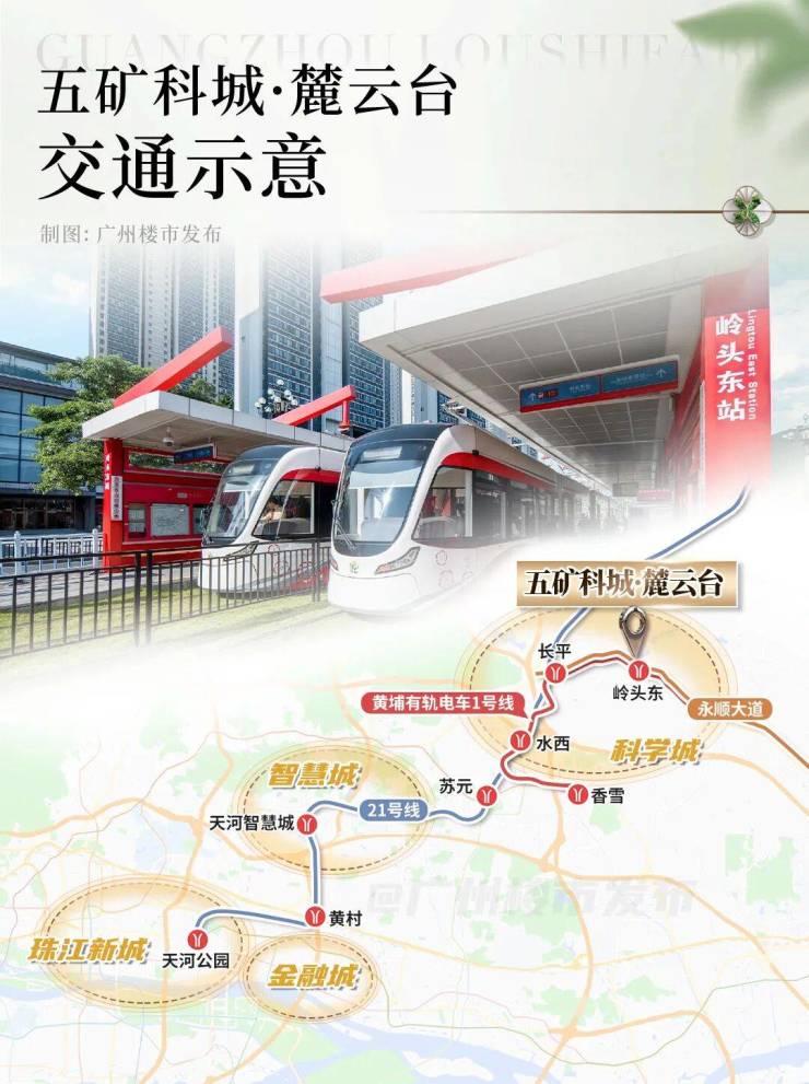 麓云台的优势在于,门口40米即为黄埔有轨电车1号线岭头东站,通过便捷换乘21号线,可快速接驳珠江新城、金融城等核心板块(距离来源:百度地图直线测距)。