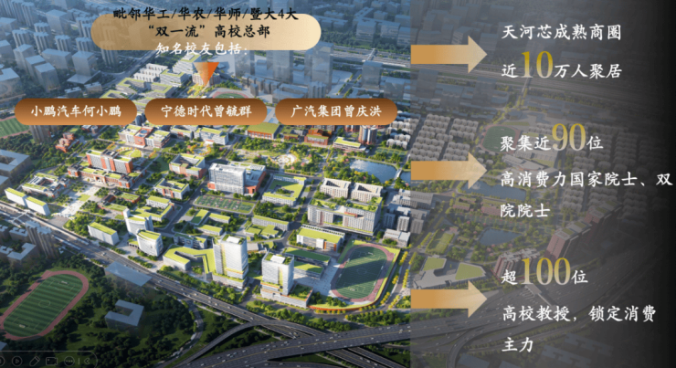 「汇聚华工/华农/华师/暨大4大“双一流”高校总部」,聚集近30位国家院士、62位双院院士、数百位高校教授,更有小鹏汽车何小鹏、宁德时代曾毓群,广汽集团曾庆洪等知名华工校友,稀缺高知圈层。