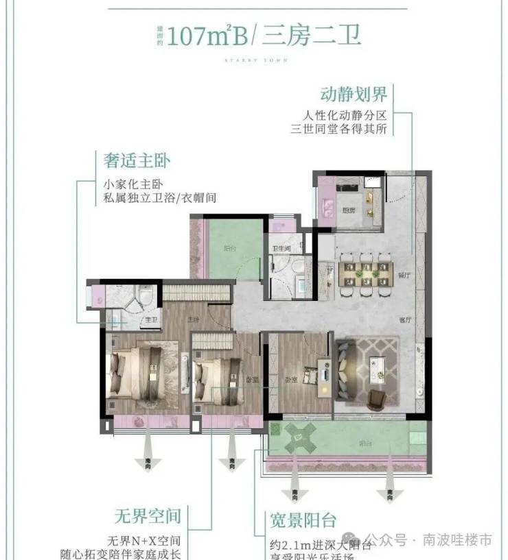 107㎡A 4空间2厅2卫,4.5 开间朝南,客厅主卧双南北对流,5.9米长观景阳台!交互式方厅,可开可合
