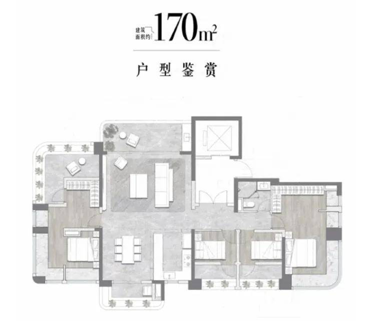 168-170㎡四房两厅两卫是主力户型之一,经典竖厅设计,客厅开间 4.2 米,双卫生间配置,能满足三代同堂的居住需求。