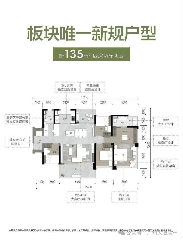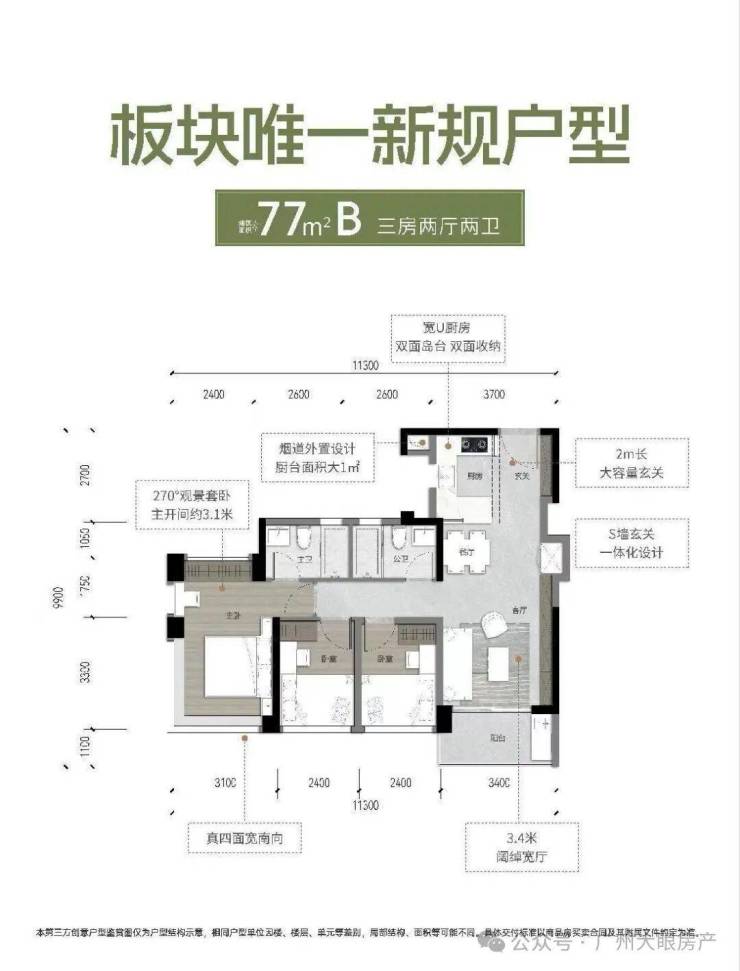 推出建面约77-135㎡三四房新规户型,万科檐屿城使用率最高可达约138%,并通过270°全景舱主卧、四面宽朝南约7米阳台等设计,将生活充分向自然打开,让LDKB一体化客厅和可变空间