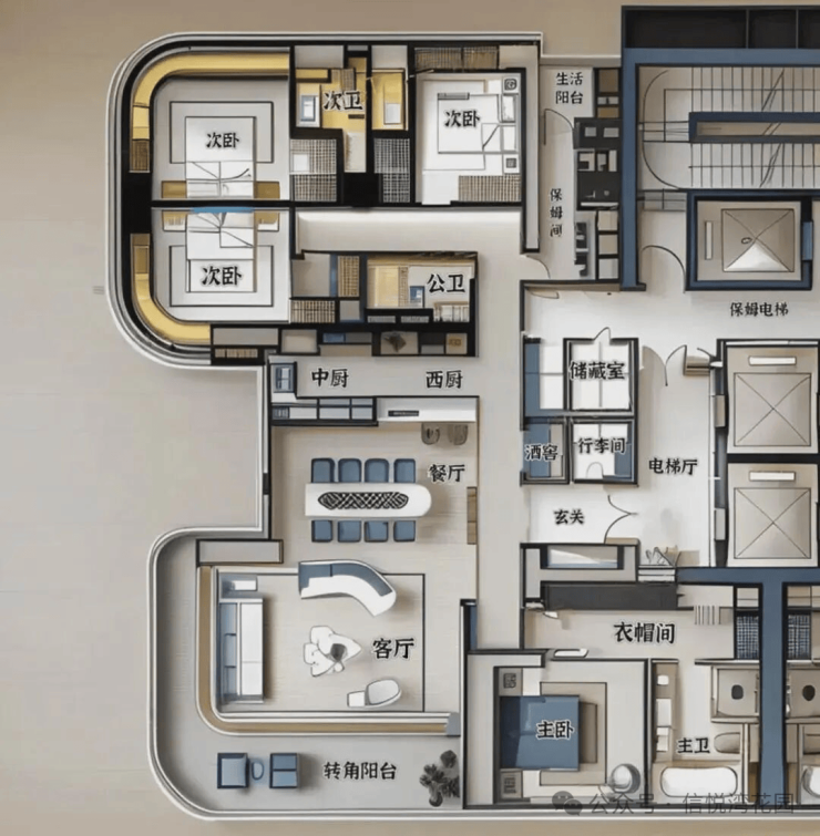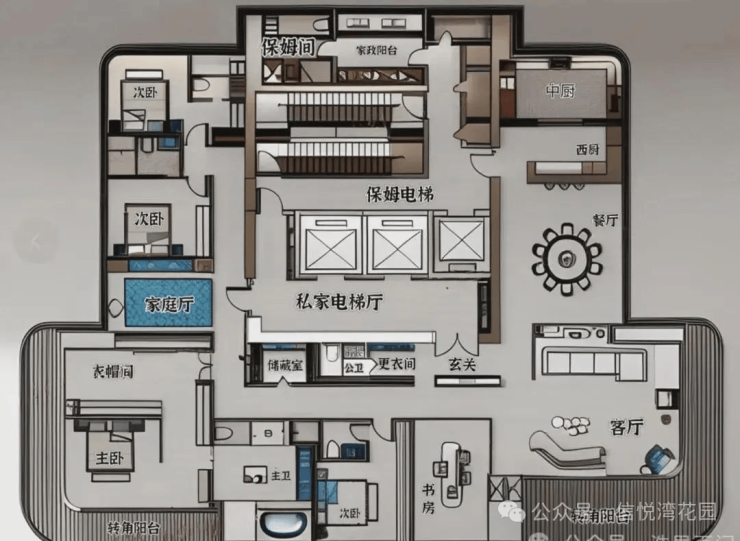 5梯2户:近乎私梯的配置(平均2.5梯服务1户),出行便捷无忧。适合追求极致空间体验与顶级服务的家族或精英领袖。