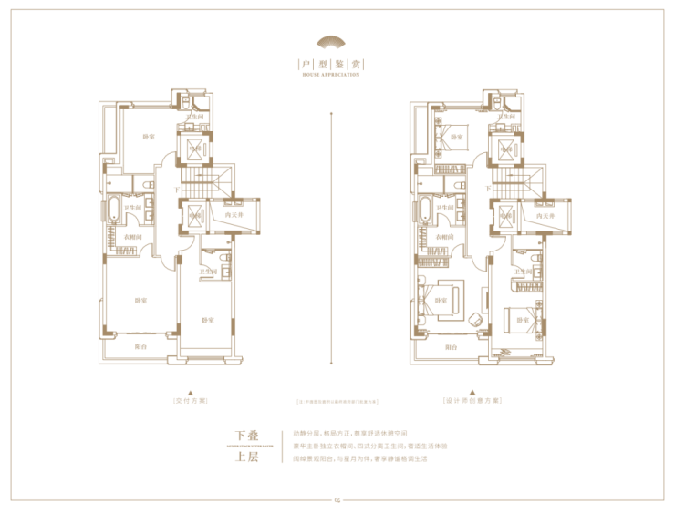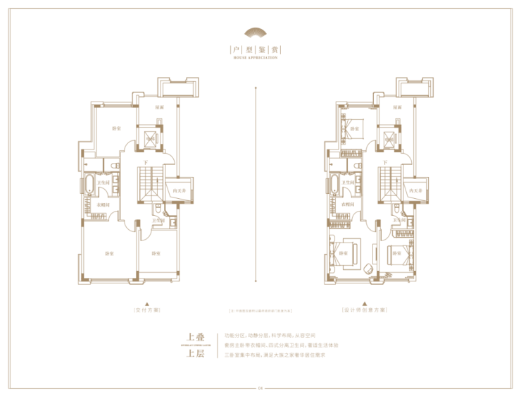 上叠,建面约240㎡,独立入户,首层是独立会客厅和长辈房,二层是三间卧室。