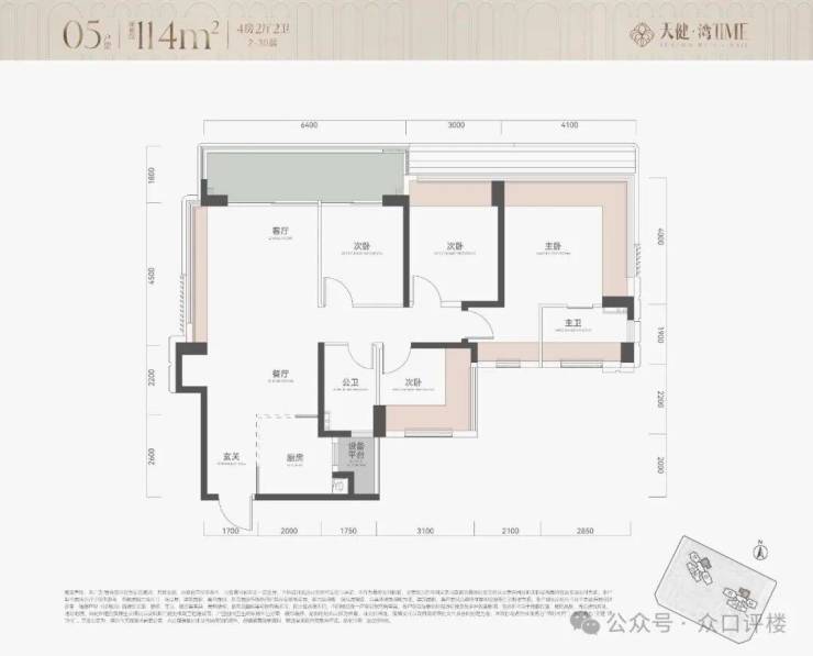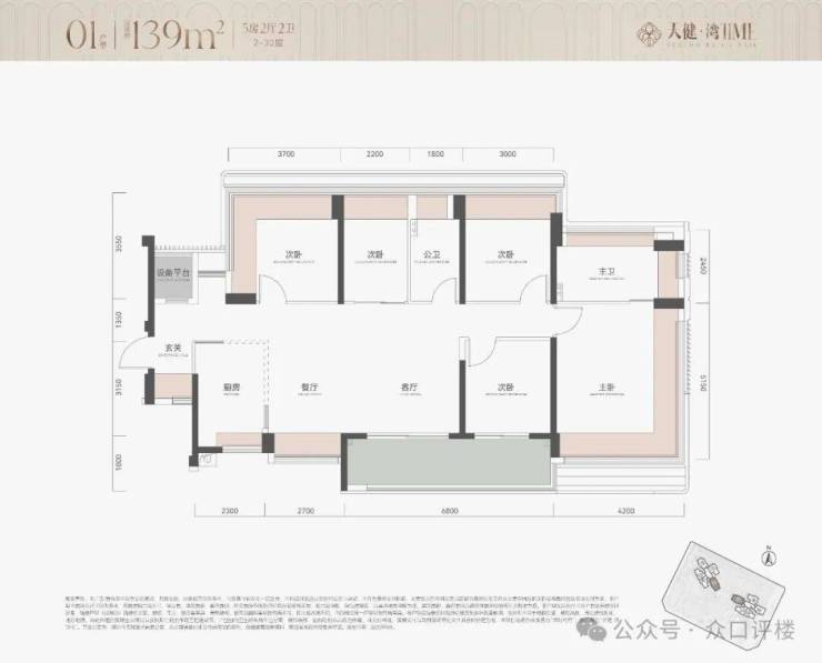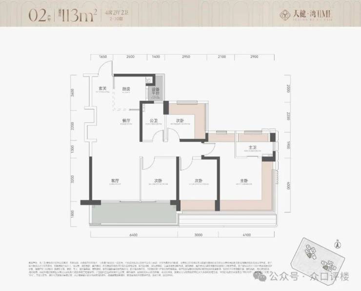 户型产品为113㎡ 4房和139㎡ 5房 约290套,2栋100米内31层住宅,2梯4户,其中主力为113㎡ 4房,具体户新图暂未公布。