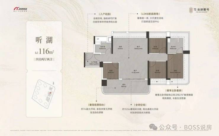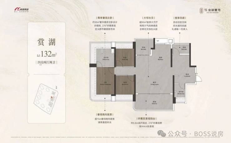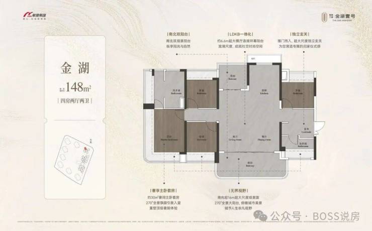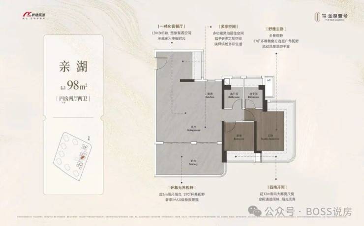 约98-148㎡全南向湖居四房,对标当代华宅范本,创变居住空间的新想象;全南向新规的突破、环拥天地的居住空间、精工雕琢细节之美,打造湖居理想之家,为万博CBD钜献湖居壹号作品。