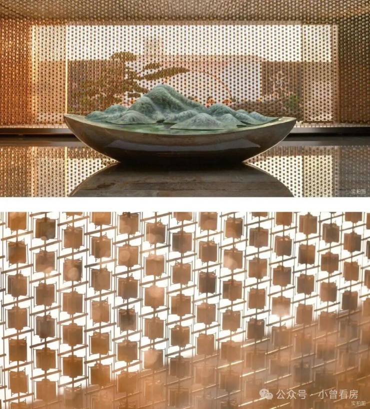 取春天清风徐来、水波不兴的意象,以“广绣隐现、幕墙灵动”为设计概念,打造泗水归堂空间入口照壁屏风,彰显归家尊贵感与品质。