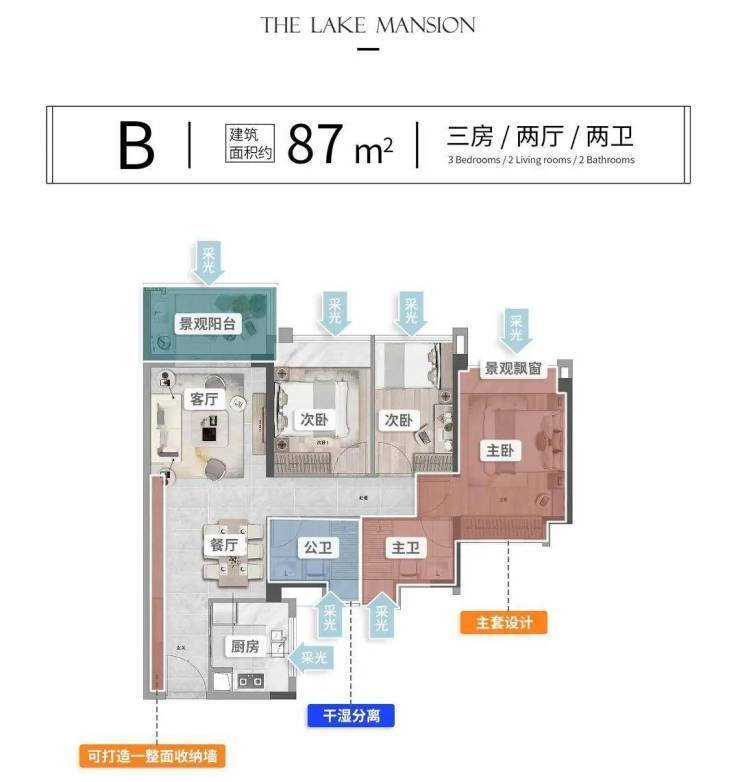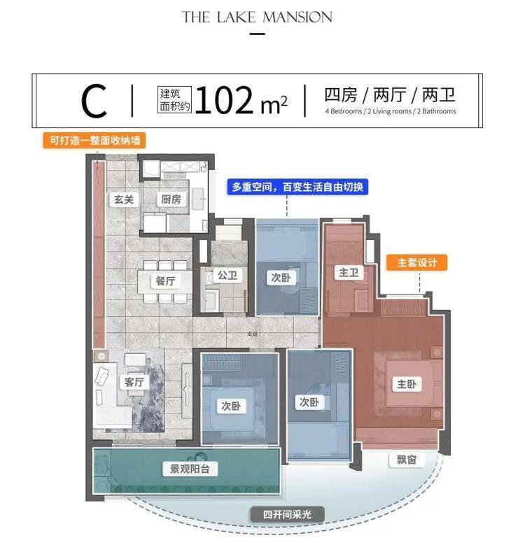 越秀·天悦云湖提供的户型设计注重实用性和舒适度。项目主打建面约87-127平方米的三至四房户型,涵盖了多种面积段,适合不同家庭的需求。其中,87平方米的三房户型层高约3米,客餐厨一体化设计,主卧带观景飘窗,营造出舒适的居住环境。102平方米的四房户型则采用了大气的四开间布局,通透明朗,约6米长的阳台提供了IMAX般的景观享受。94平方米的四房户型空间使用更加灵动,经典竖厅设计搭配市面罕见的6.2米宽景阳台,南北对流,采光更通透。107平方米的四房户型拥有约6.7米的超大南向巨幕阳台,全景式飘窗让每一寸空间都充满阳光。127平方米的四房户型则采用了奢阔的主套设计,私享L型豪华衣帽间及景观飘窗,LDK(餐客厨一体)横厅设计,家庭互动更加便捷。