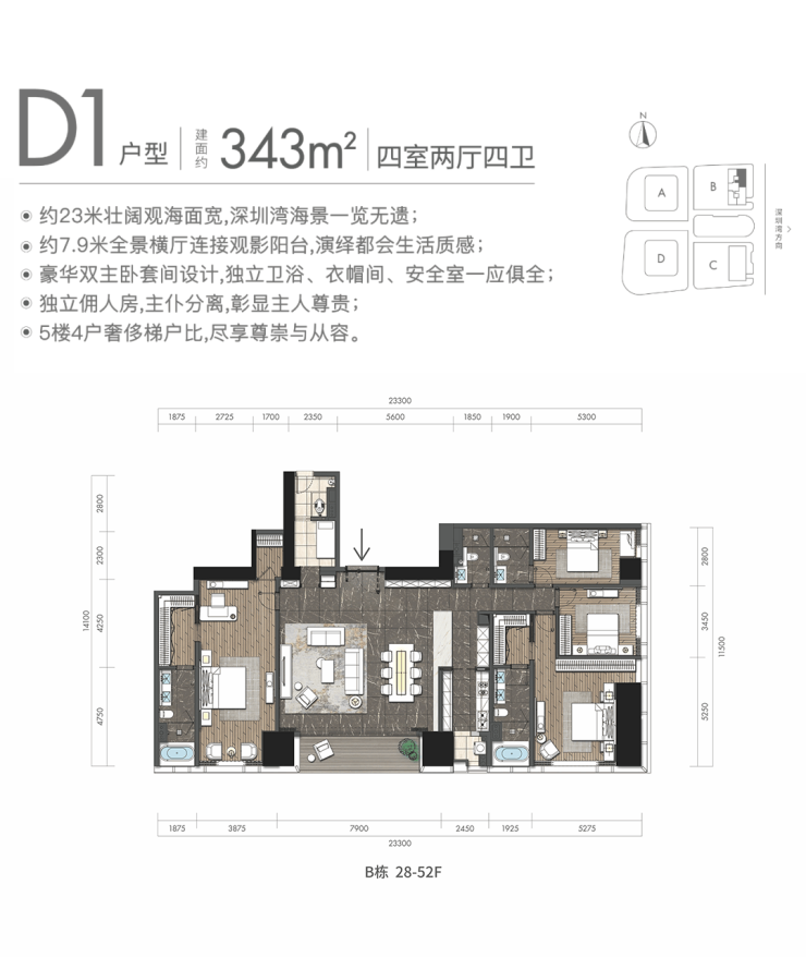 D1户型:约343㎡4房2厅4卫:B栋28-52F(高区),东朝向