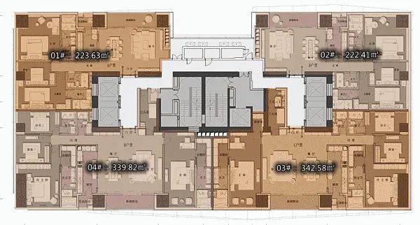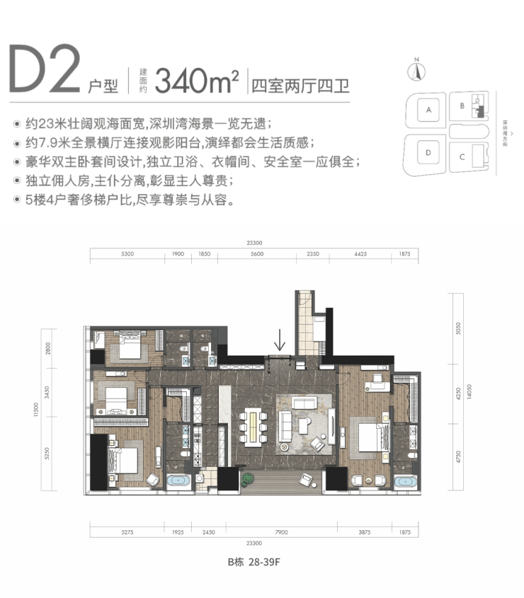 D2户型:约340㎡4房2厅4卫:B栋28-52F(高区),东朝向,户型与343㎡户型基本相同。