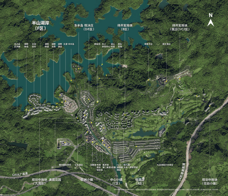 中旅阿那亚九龙湖是一个物业属性丰富的超大社区,包括:已开发悦源庄(A区)、悦沐庄(D区/E区)、美茵花园、东半岛等区域;正在热销的中心小镇(C区)、半山湖岸(F区),待开发的B区、国王区等,100万㎡的建筑体量将成就又一个旅游地标。