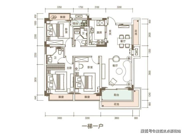 A1户型三房两厅三卫:建筑面积约116㎡