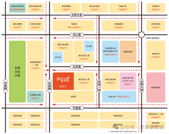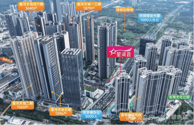 星河天地分为6期开发,建面80万方,共计7000户,总计约30000人,800米内金地峰境瑞府、新地中央、绿地新都汇、金茂公园里、万科光年四季、佳兆业云峰汇、深业颐瑞府、宏发万悦山、学校、园区等消费客群超5万人。